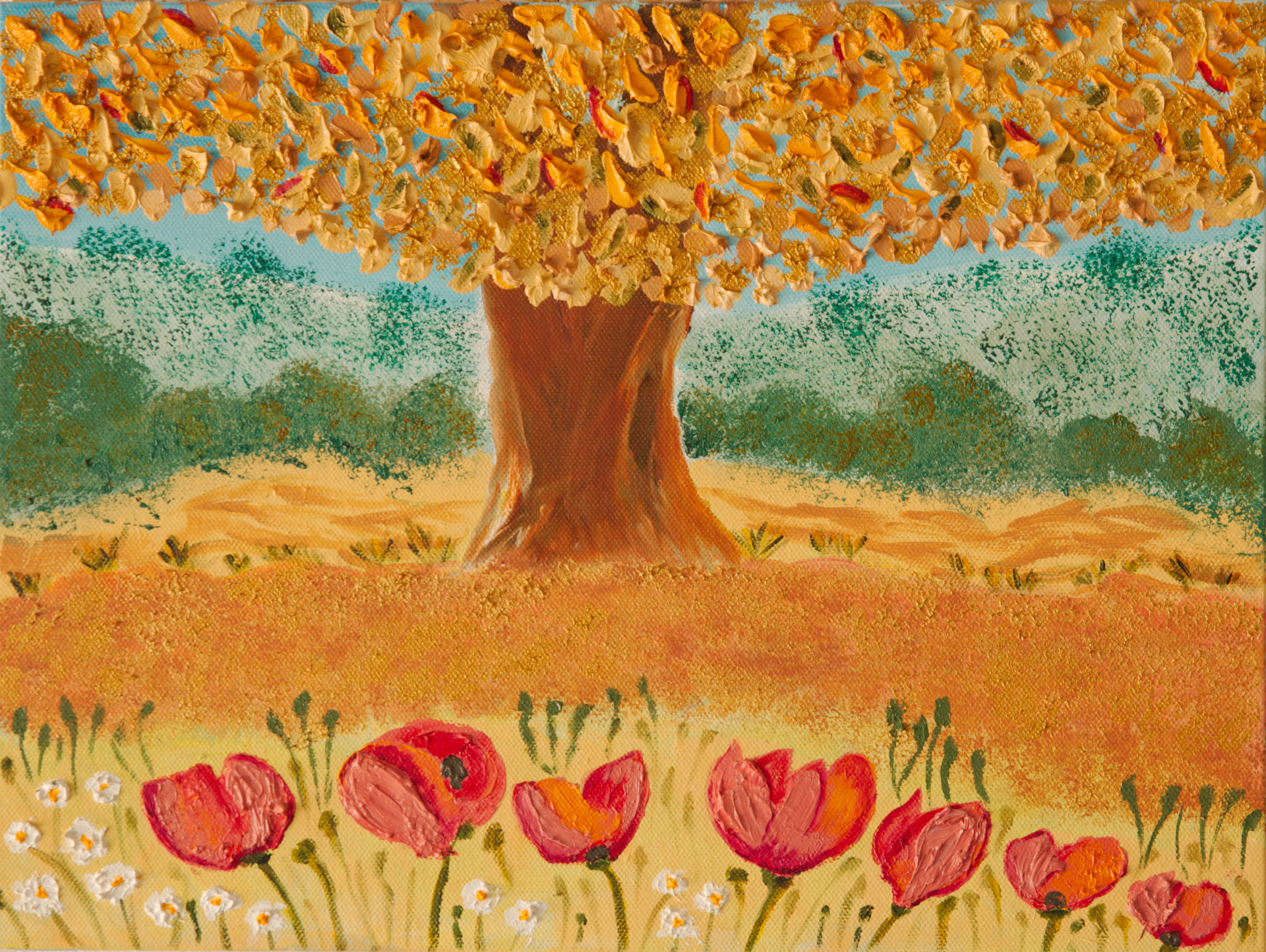 Finding my art feet after the COVID lockdown was not easy. I started small, focusing on a single tree with a canopy of heavily textured leaves to evoke a 3D profile. I used heavily paint saturated brushes to apply the paint in thick layers. It was a great experiment relying on muscle memory to find those lines and colors.