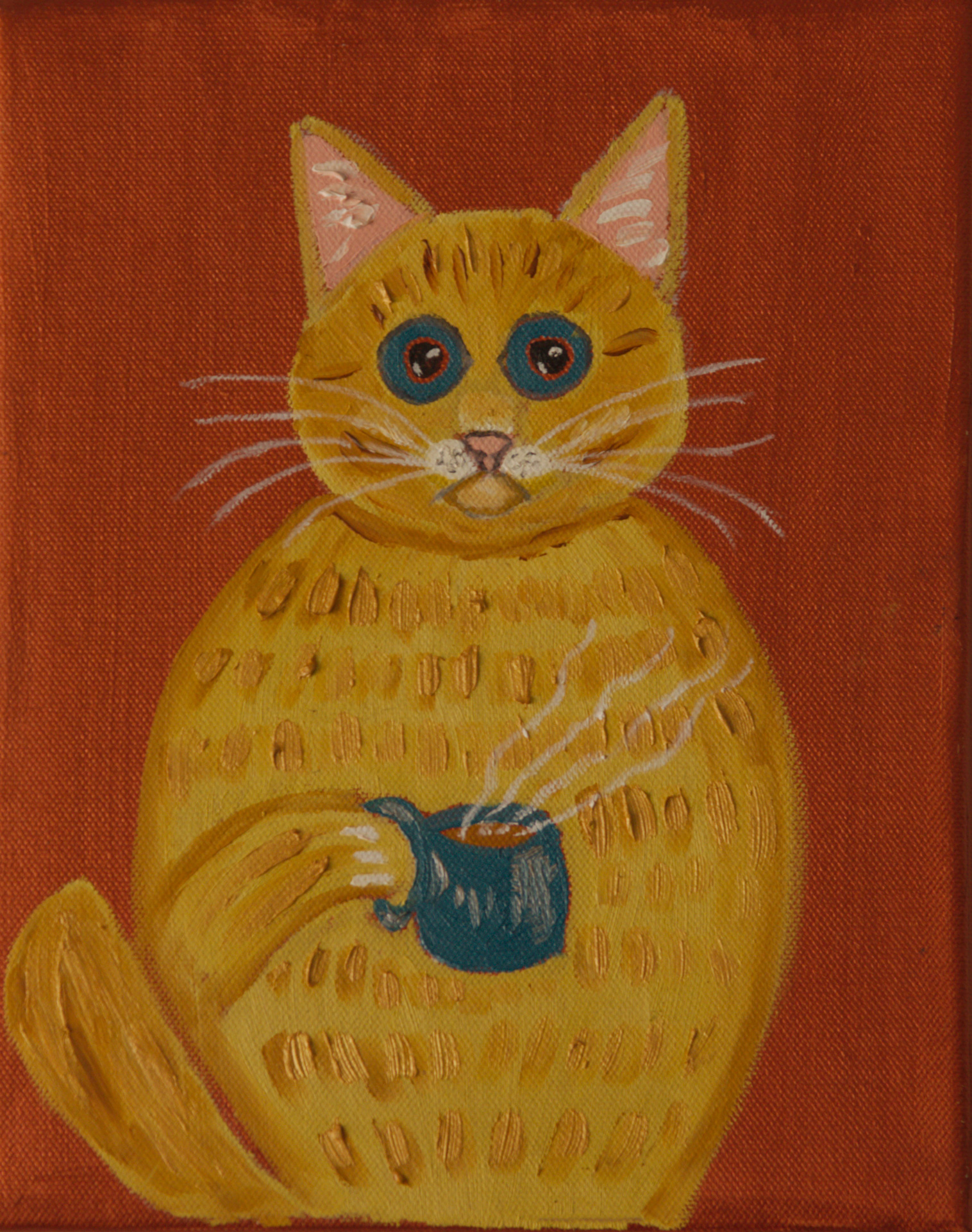 A friend’s morning greeting of a kitty enjoying a cappuccino inspired this painting.