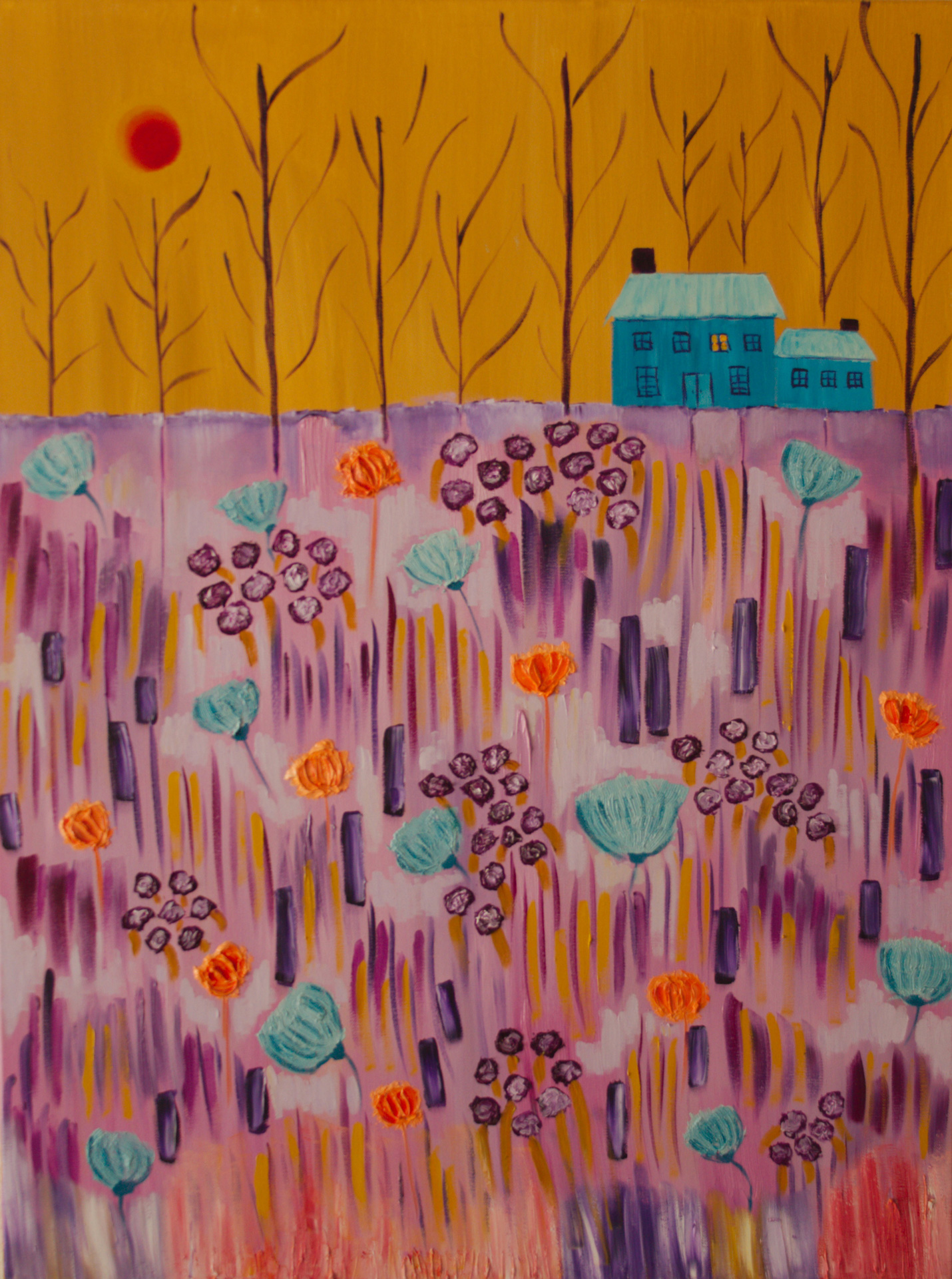 Lying beneath the solid winter ground is spring, waiting to burst forth. In my fantasy painting, there is a world of color and texture beneath the forlorn house and bare trees. There is a hope – a single window is lit with a warm yellow light.