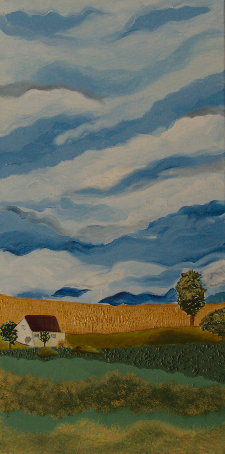 An Apple screensaver prompted thoughts of a striped sky providing a canopy to fields of golden corn and a small farmhouse. Using that as a reference I painted the cottage caught between the lush golden field, heaving textured with gold paint, and verdant pastures in front of the house. It took some time to update the foreground – it was a puzzle that needed inspiration!