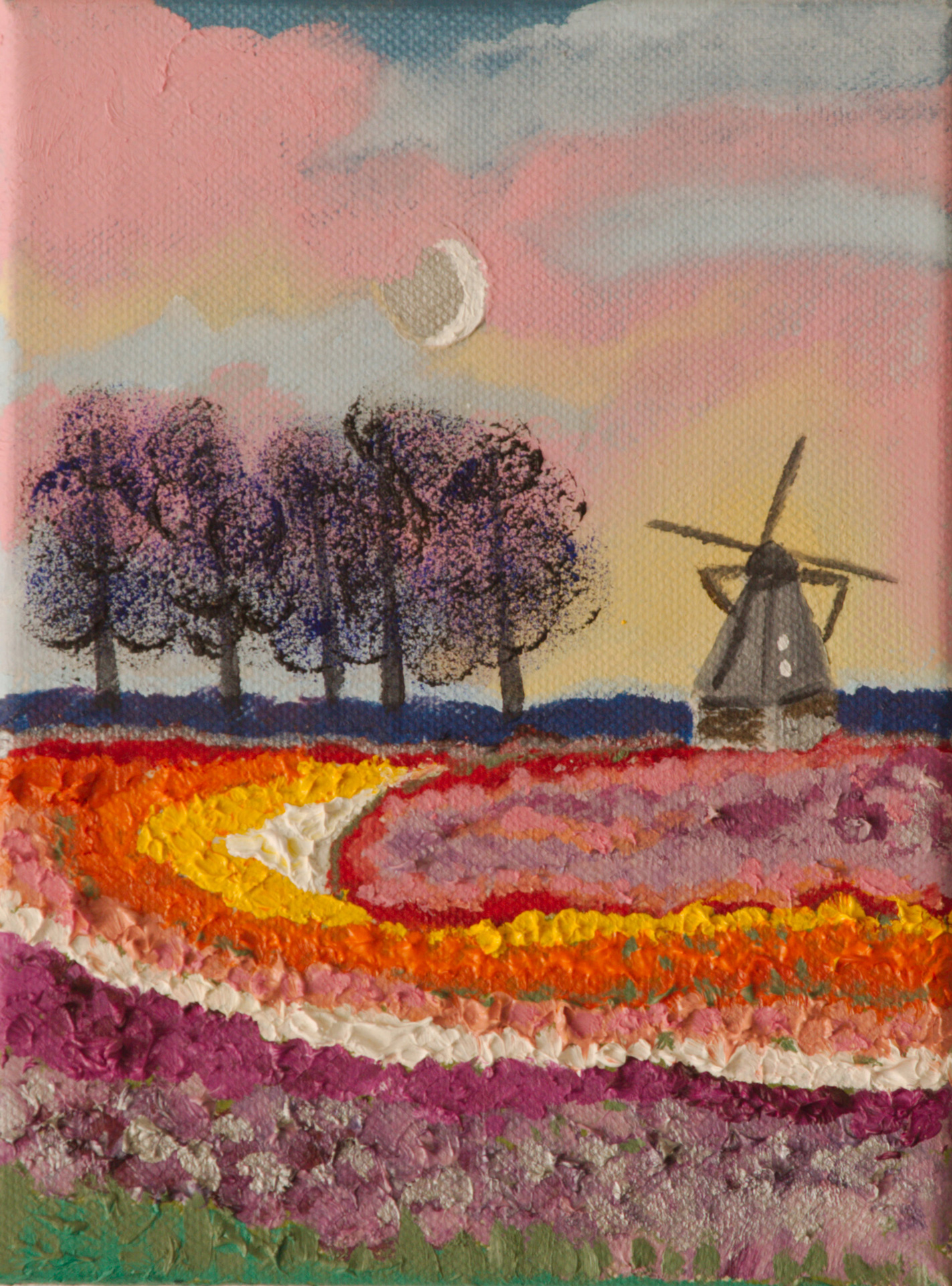 The incredible colours and masses of tulips every spring on display at Lisse in the Netherlands called for an annual trek when living in Belgium. These memories inspired me to paint a mini version using bold colours to evoke the colourful vista.